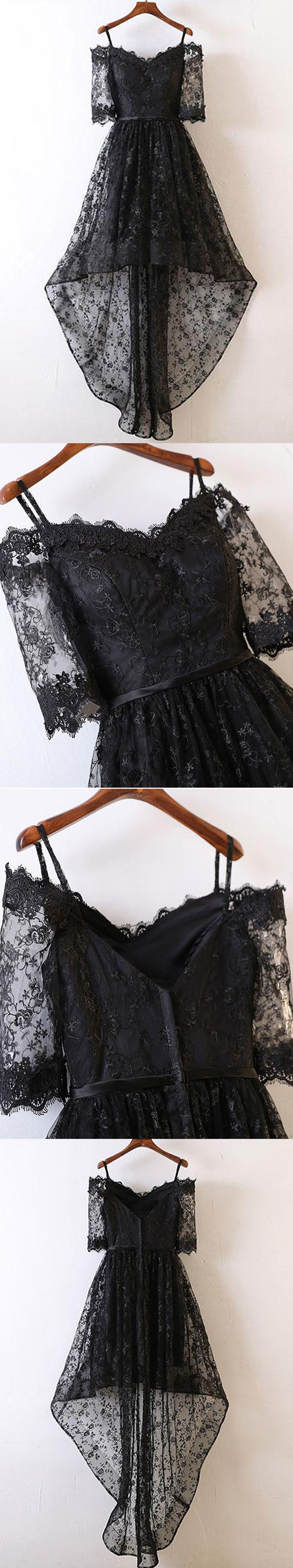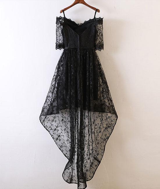 Black homecoming dress, high low homecoming dress, lace homecoming dress, short sleeves homecoming dress, off the shoulder homecoming dress, PD15045