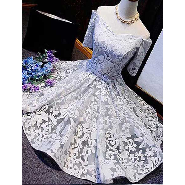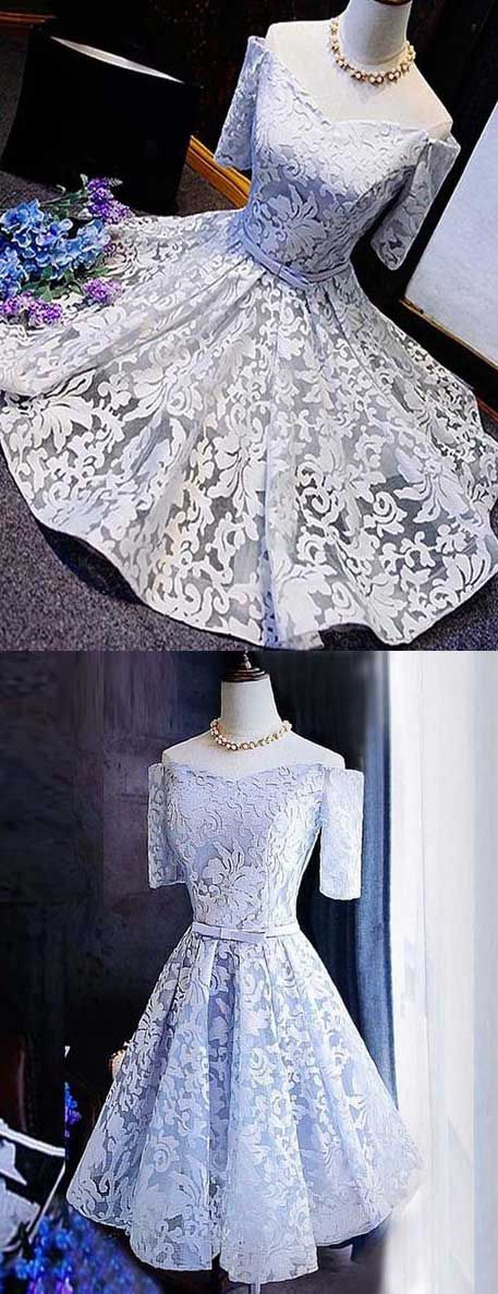 Short sleeves homecoming dress, off the shoulder homecoming dress, lace homecoming dress, short homecoming dress, lovely homecoming dress, PD15091