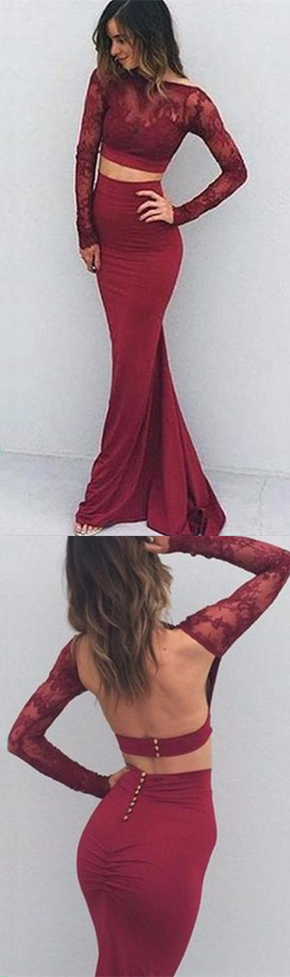 Burgundy prom dress, long sleeves prom dress, two pieces prom dress, lace top prom dress, mermaid prom dress, sexy backless prom dress, PD15099