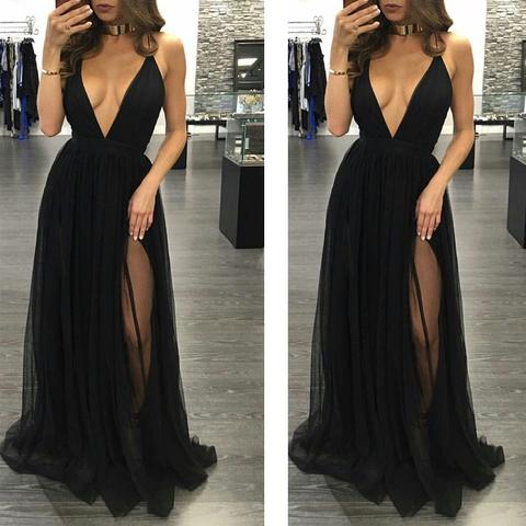 Black prom dress, sexy prom dress, v neck prom dress, side split prom dress, long prom dresses, evening dress, tulle prom dress, PD15148