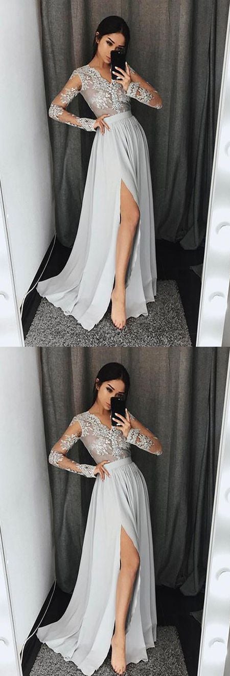Long prom dress, v neck prom dress, lace prom dress, sexy side split prom dress, long sleeves prom dress, silver prom dress, PD15175