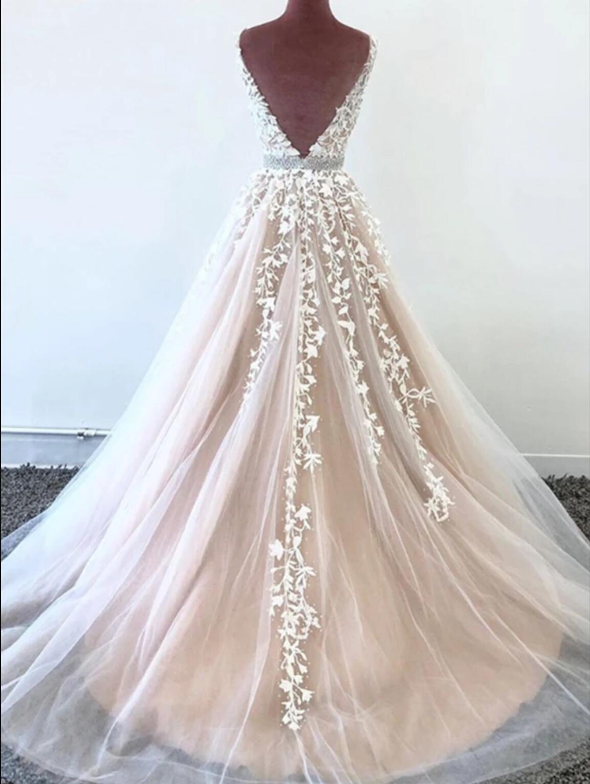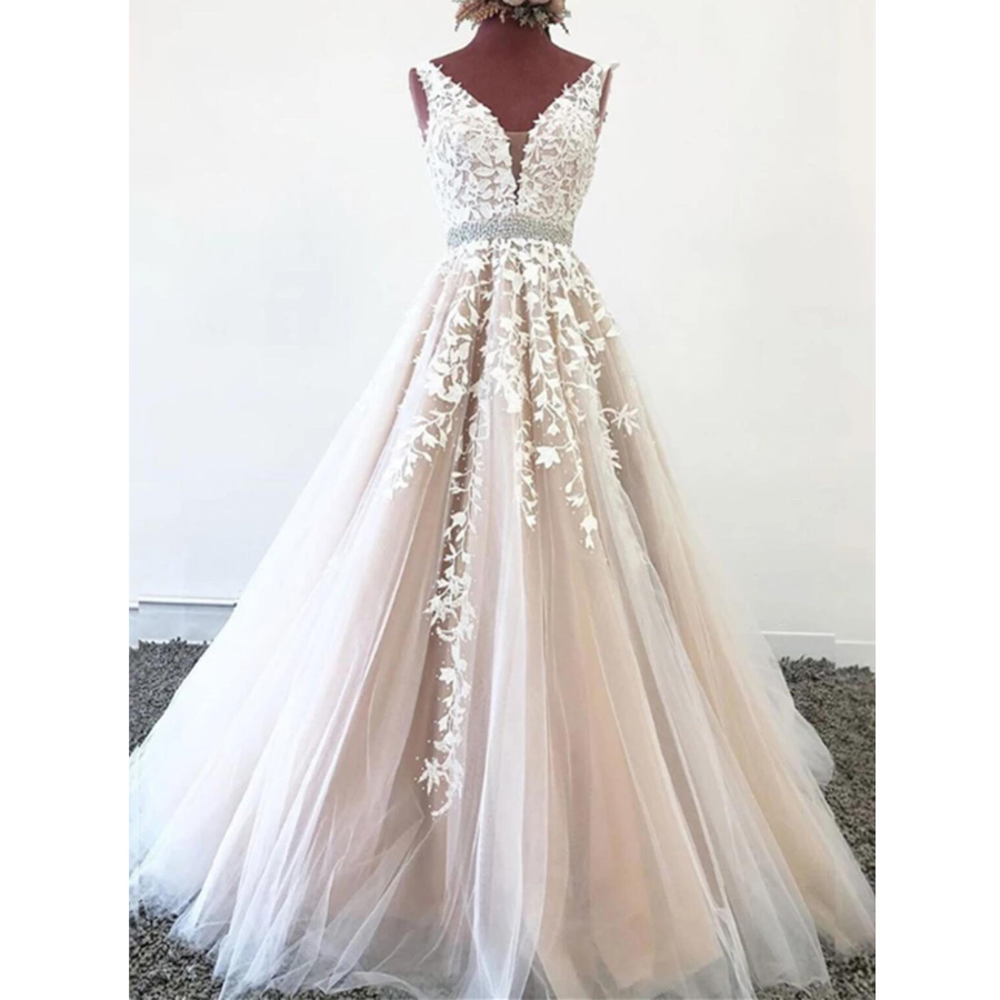 Popular A-line V-neck Applique Tulle Long Prom Dresses PD15273